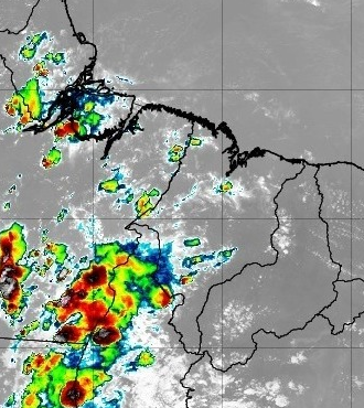 Imagem do satélite meteorológico GOES-19 na tarde do dia 11 de outubro de 2025. As áreas coloridas são nuvens de grande desenvolvimento vertical geralmente associadas com tempo adverso e que estavam predominantes no sul do Maranhão.