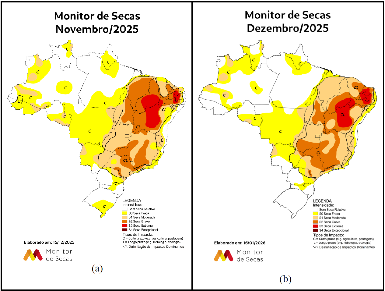 Este documento descreve, resumidamente, as maiores variações apresentadas no Mapa do Monitor de Secas do mês de dezembro de 2025 (Figura 1b) em comparação ao mês anterior (Figura 1a). Em dezembro de 2025, os destaques são feitos por Região e por Unidade da Federação, acompanhando-se o surgimento, desaparecimento, evolução ou involução do fenômeno da seca em cada uma dessas áreas.