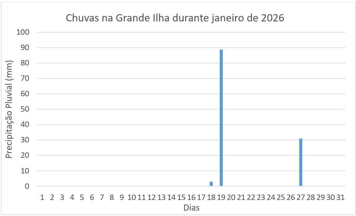 Deste modo, as chuvas no mês de janeiro deste ano, foram muito irregulares na grande Ilha com registros de chuvas de apenas 3 dias 18, 19 e 27 com 3mm; 88,8mm e 31mm, respectivamente, Figura 1. Em apenas dois dias de chuvas (19 e 27), apresentando um total acumulado de 119,8 mm, ou seja, 51% do esperado para o mês de janeiro onde a média climatológica é de 235,4 mm. Esse foi o menor total mensal acumulado no mês de janeiro e a pior distribuição temporal das chuvas nos últimos 11 anos, desde janeiro de 2015 que registrou um total acumulado de 30 mm, também distribuídos em três dias.