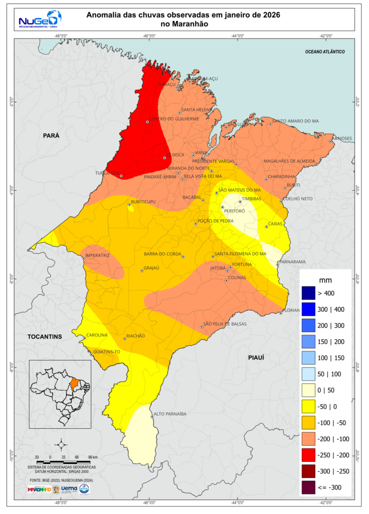 No centro-norte e no leste do estado, predominam anomalias negativas moderadas, variando entre −100 mm e −200 mm, indicando chuvas abaixo da climatologia, porém com menor intensidade em comparação às áreas mais críticas do Norte. Por outro lado, o centro-sul e parte do sul maranhense apresentam anomalias próximas da normalidade ou ligeiramente positivas, com excedentes localizados que chegam a valores entre 0 e 50 mm, sugerindo condições pluviométricas mais próximas do padrão esperado. De forma geral, o mapa evidencia uma forte heterogeneidade espacial das anomalias, ressaltando a irregularidade da distribuição das chuvas no estado e seus potenciais impactos sobre a disponibilidade hídrica, o planejamento das atividades agrícolas e o acompanhamento de situações de déficit hídrico no início de 2026.