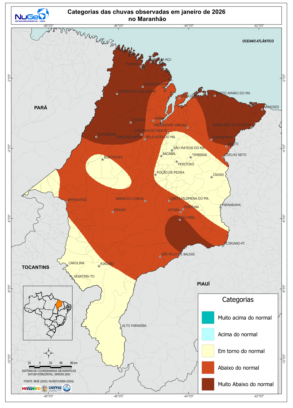 A categoria abaixo do normal abrange extensas áreas do centro, oeste e sul do Maranhão, indicando que, embora tenham ocorrido precipitações ao longo do mês, os volumes registrados não foram suficientes para atingir os valores médios climatológicos. Por outro lado, áreas classificadas como em torno do normal aparecem de forma pontual, sobretudo no centro-leste e em partes do sul do estado, sugerindo uma distribuição espacial irregular das chuvas. Não se observa a presença significativa das categorias acima do normal ou muito acima do normal, reforçando o caráter predominantemente deficitário das precipitações em janeiro de 2026.