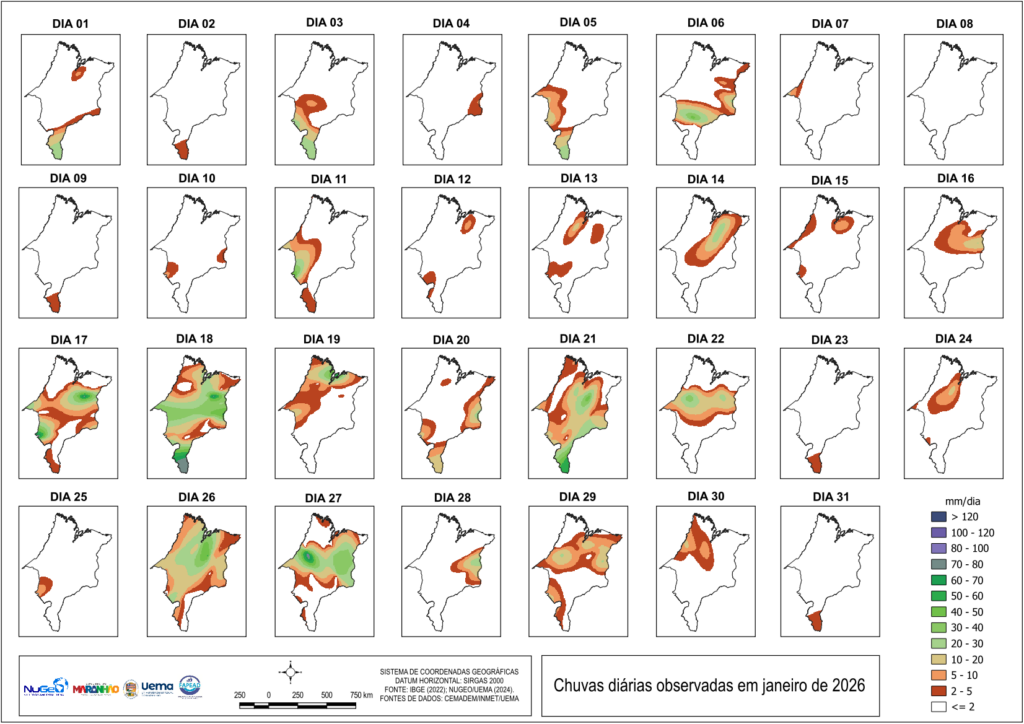 Cada painel representa um dia específico do mês, permitindo analisar a variabilidade temporal e espacial das precipitações ao longo do período. Observa-se que os eventos de chuva ocorreram de forma irregular, tanto em termos de intensidade quanto de abrangência territorial, com alternância entre dias com precipitações localizadas e dias com volumes mais expressivos distribuídos em áreas mais amplas do estado. Em vários dias, os acumulados diários concentraram-se em setores específicos do território maranhense, especialmente nas regiões central, sul e leste, evidenciando a natureza pontual das chuvas em grande parte do mês.