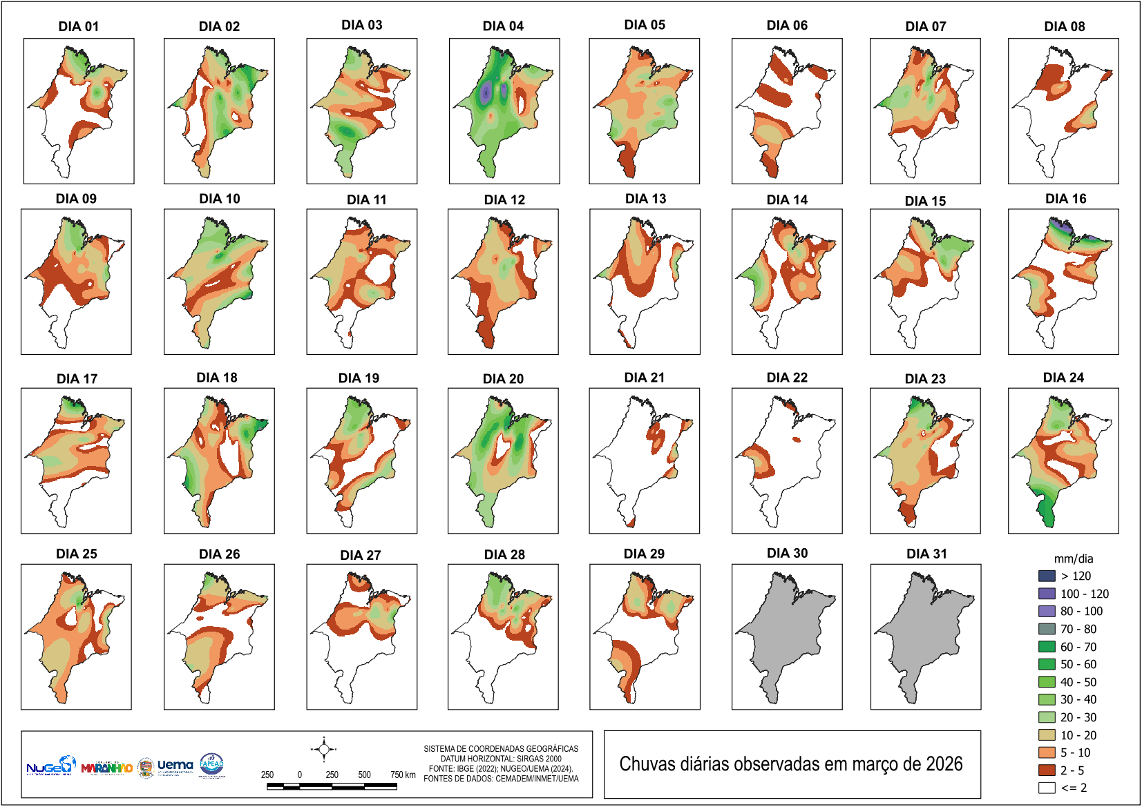TABELA DAS CHUVAS EM MARÇO DE 2026 NO ESTADO DO MARANHÃO (mm) até o último dia disponível