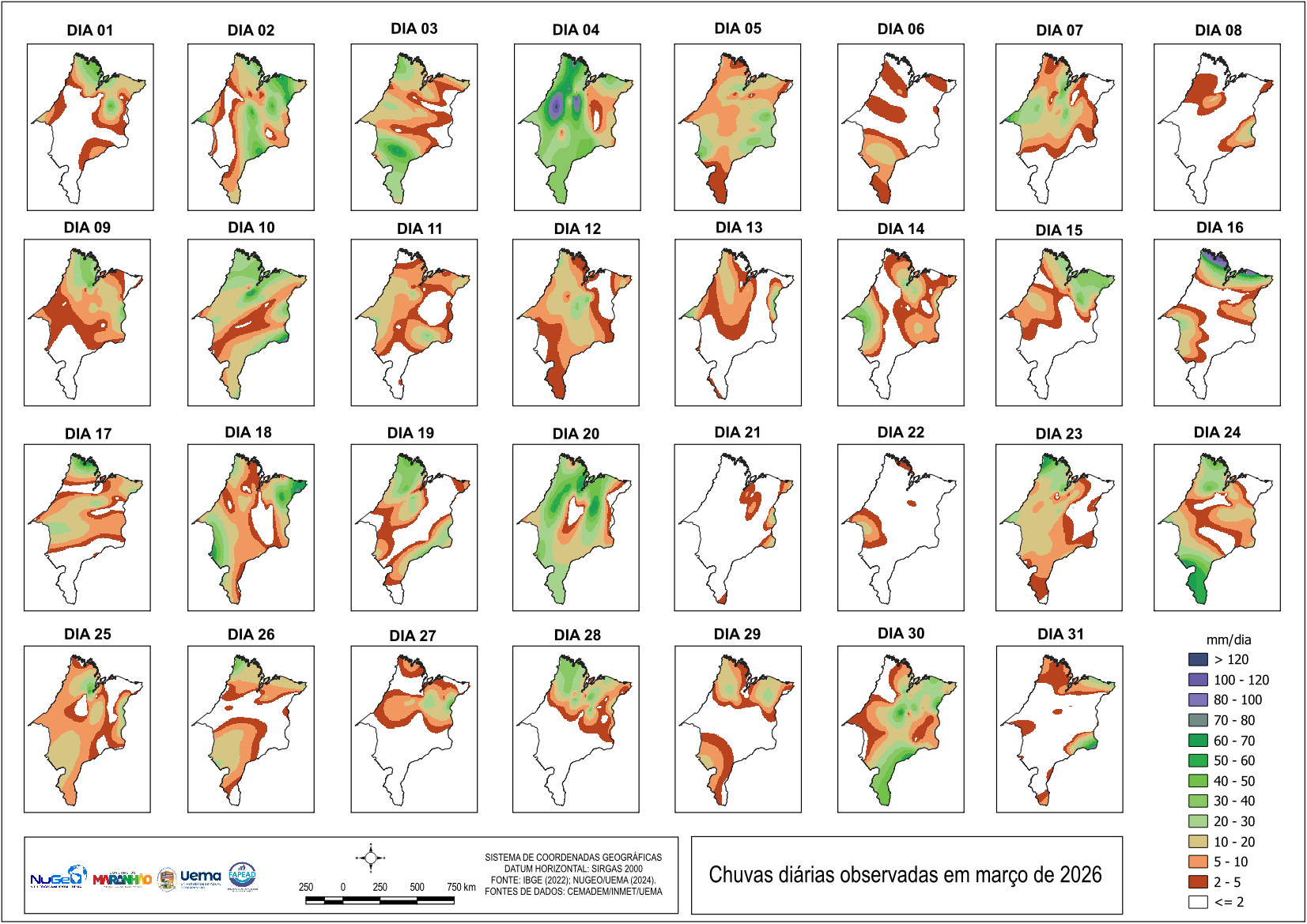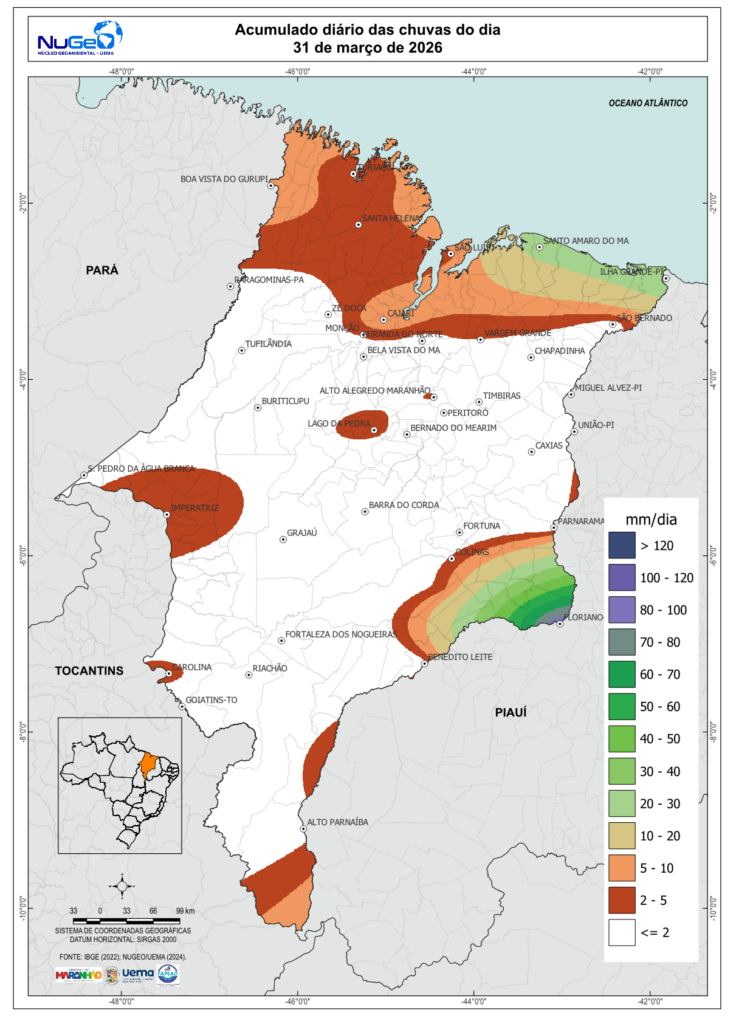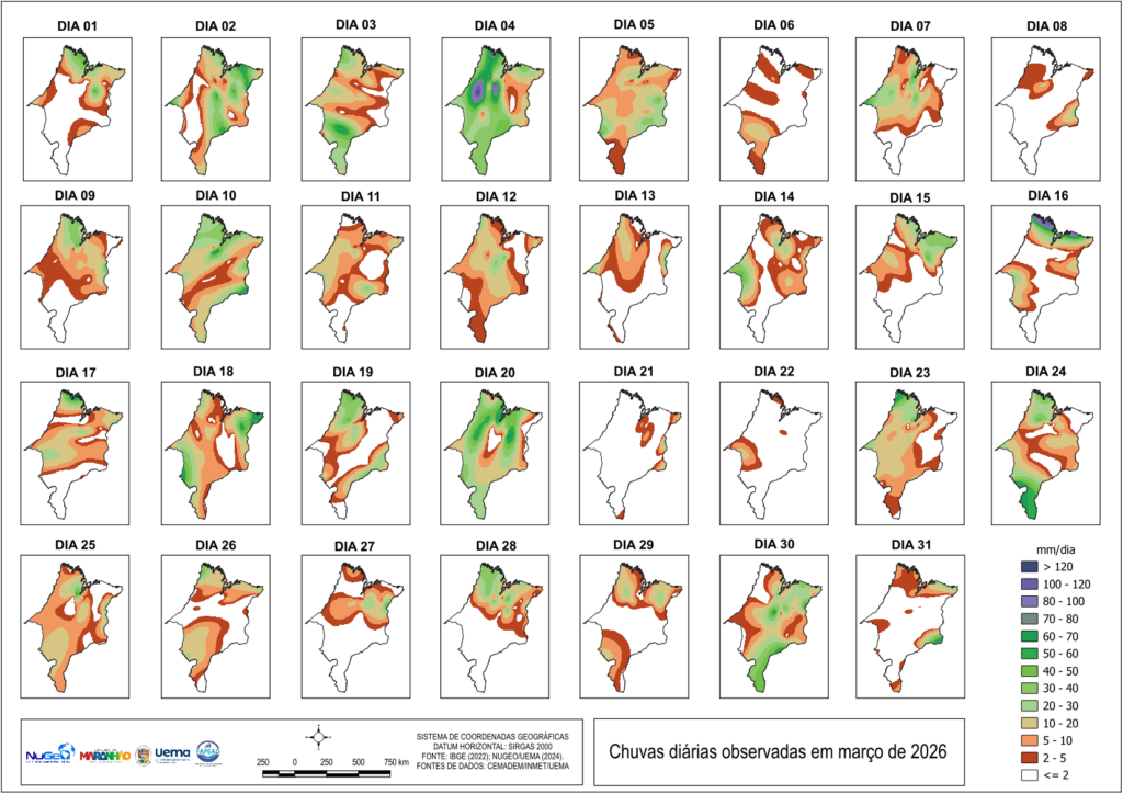 TABELA DAS CHUVAS EM MARÇO DE 2026 NO ESTADO DO MARANHÃO (mm) até o último dia disponível