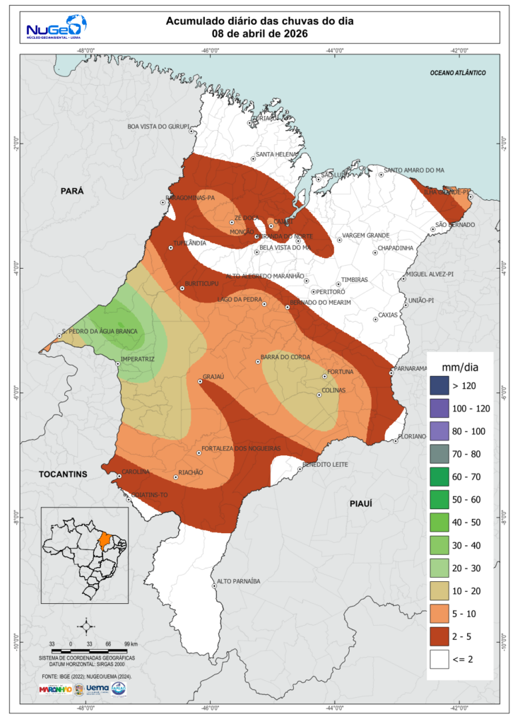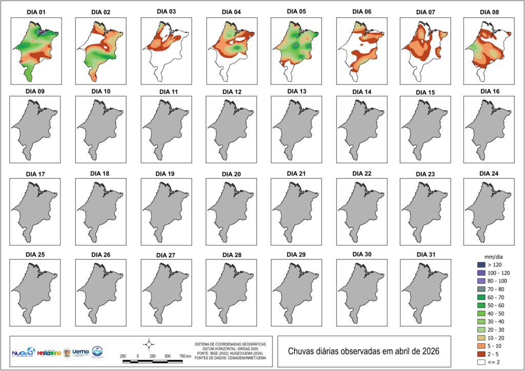 Mapa de chuva ocorrida nas últimas 24 horas.TABELA DAS CHUVAS EM ABRIL DE 2026 NO ESTADO DO MARANHÃO (mm) até o último dia disponível