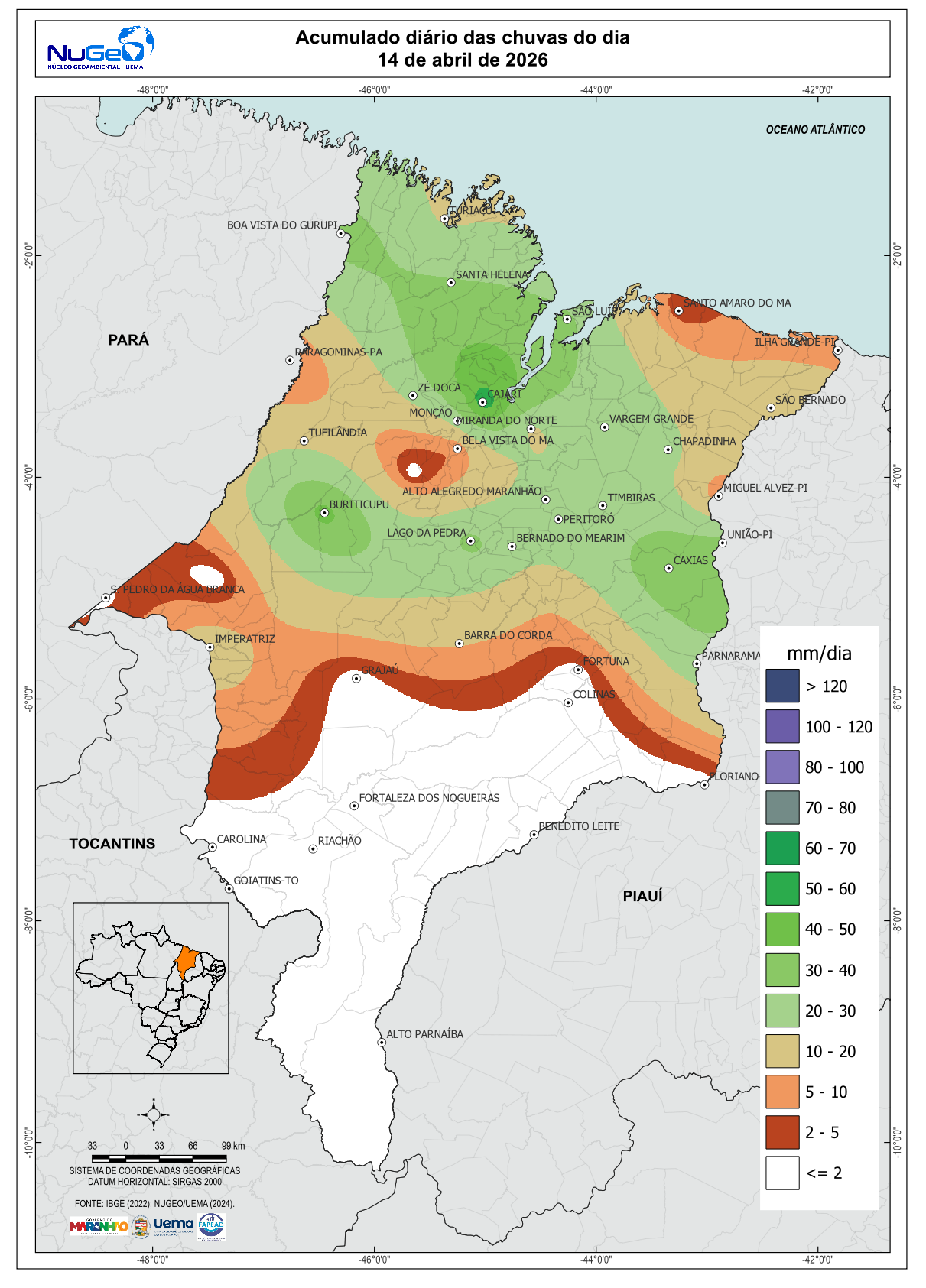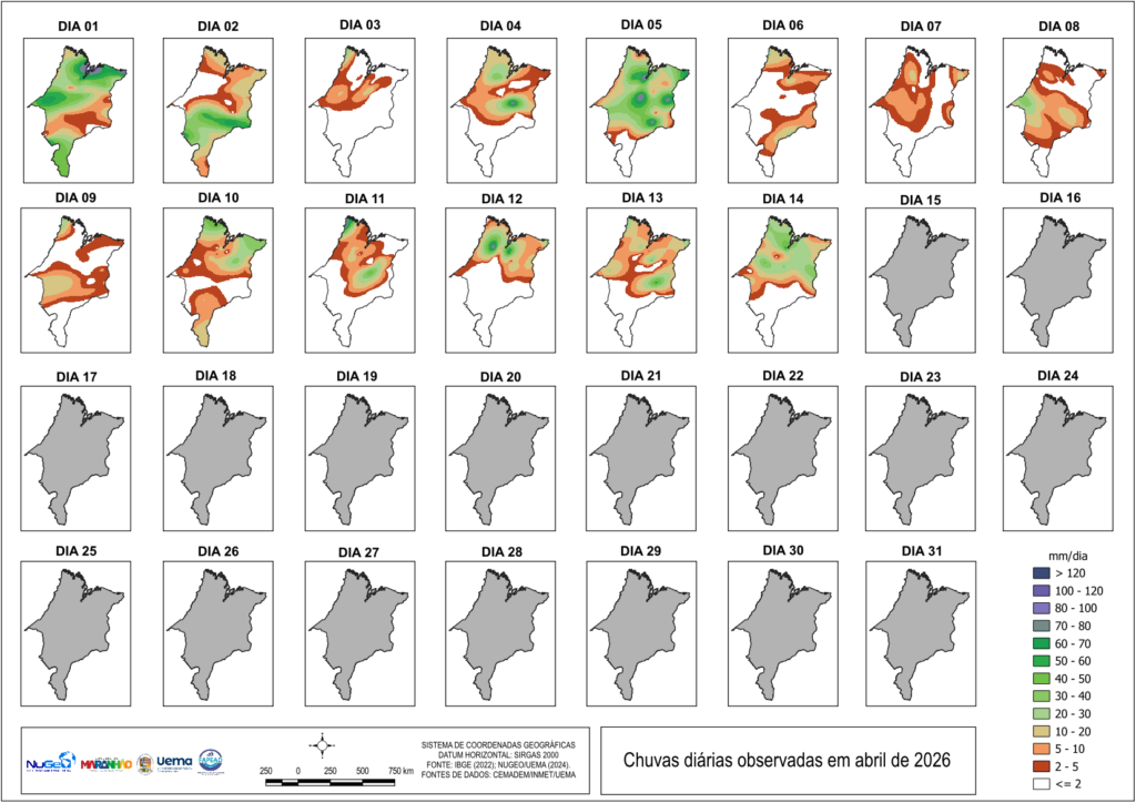 TABELA DAS CHUVAS EM ABRIL DE 2026 NO ESTADO DO MARANHÃO (mm) até o último dia disponível